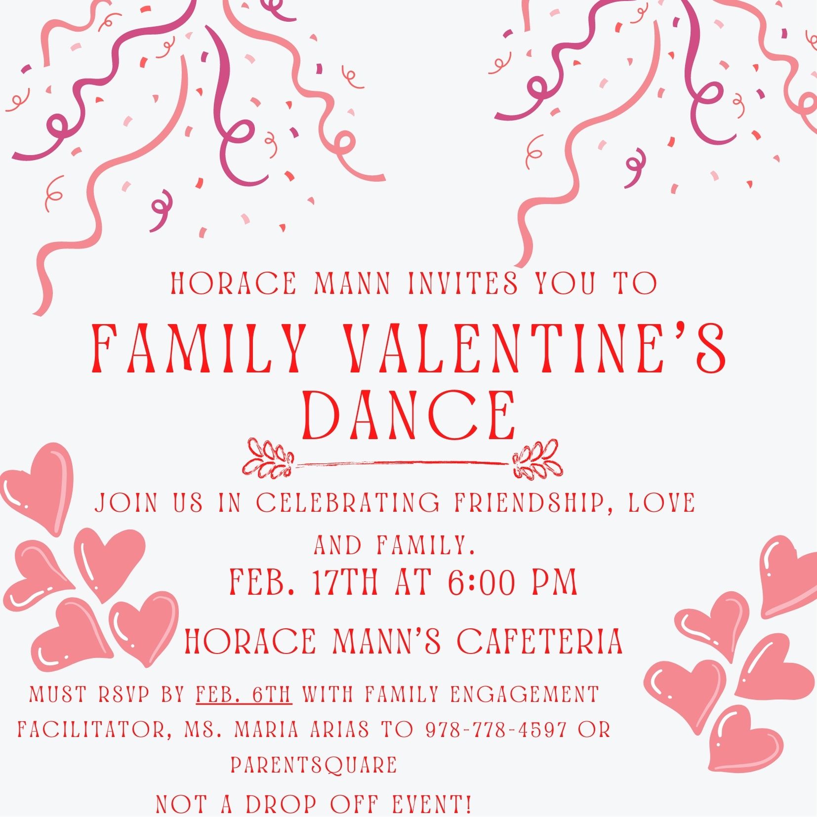 You are all invited to our Family Valentines Dance!! Per parents request it will be held Friday, February 17th, 2023 from 6:00 PM- 8:00 PM. We will have food, games and a raffle!!! Terrell Greene will be our DJ!! We are excited to celebrate Friendship, Love and Family with all of you! Please RSVP by February 6th.