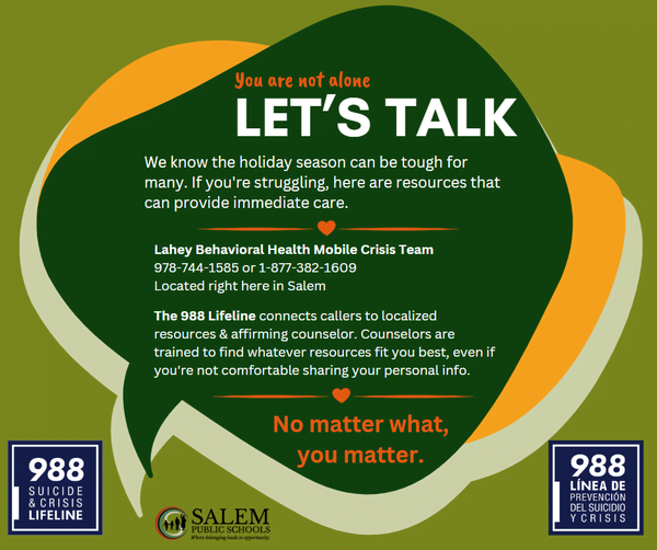 As we begin the winter season, we have seen a significant rise in illness across the Salem Public Schools. Many students and staff have been absent from school due to COVID, strong strains of the flu, and/or respiratory illnesses. This has resulted in daily adjustments to staffing and programming to ensure appropriate supervision of our students. We appreciate everyone’s flexibility as we navigate through the winter months. All schools except for Carlton have an extra week of winter vacation, and we hope this will help keep our case numbers down. Information about the flu, COVID-19, and RSV can be found on the district health and wellness page.